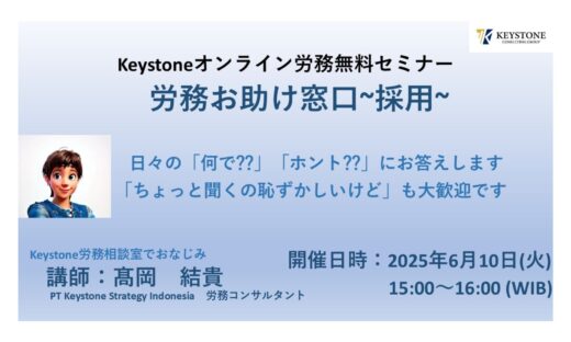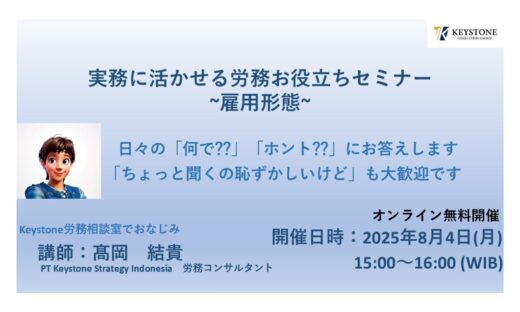 セミナー情報 無料オンラインセミナー 「実務に活かせる労務お役立ちセミナー~違法スト~」 2026.02.12 無料オンラインセミナー 「実務に活かせる労務お役立ちセミナー~違法スト~」 平素は格別のご高配を賜り厚く御礼申し上げます。 弊社では、「実務に活かせる労務お役立ちセミナー」と題し、インドネシアの労務に関する無料オンラインセミナーを毎月開催いたしております。 3月のテーマは「違法スト」です。本セミナーでは、頭を抱えてしまうような事例を元に、その対処法と再発防止策を紹介いたします。 また、質疑応答の時間も十分に取り、各社のケースに合わせた御説明も可能です。 日々の労務の疑問を弊社のセミナーで解決しませんか。 お申込はこちらから セミナー概要 日時2026年3月2日(月)15:00~16:00 WIB 開催方法ZOOMウェビナー 参加費無料 申込こちらから (締切:2026年3月1日) 講師髙岡 結貴 (PT Keystone Strategy Indonesia 労務コンサルタント) 紹介事例 事例1:黒ハチマキ隊の残業拒否 事例2:違法ストの証明 事例3:上部団体主導の違法スト ※内容は予告なく変更になる場合がございます。 ■お問い合わせ■ ご不明な点がございましたら、下記までお気軽にお問合せください。 担当 板井 Email: itai@keystone-indonesia.com Tweet Share +1 Hatena Pocket RSS feedly Pin it セミナー情報 第71回 賃金の手取り設定 第72回 宗教大祭手当の計算