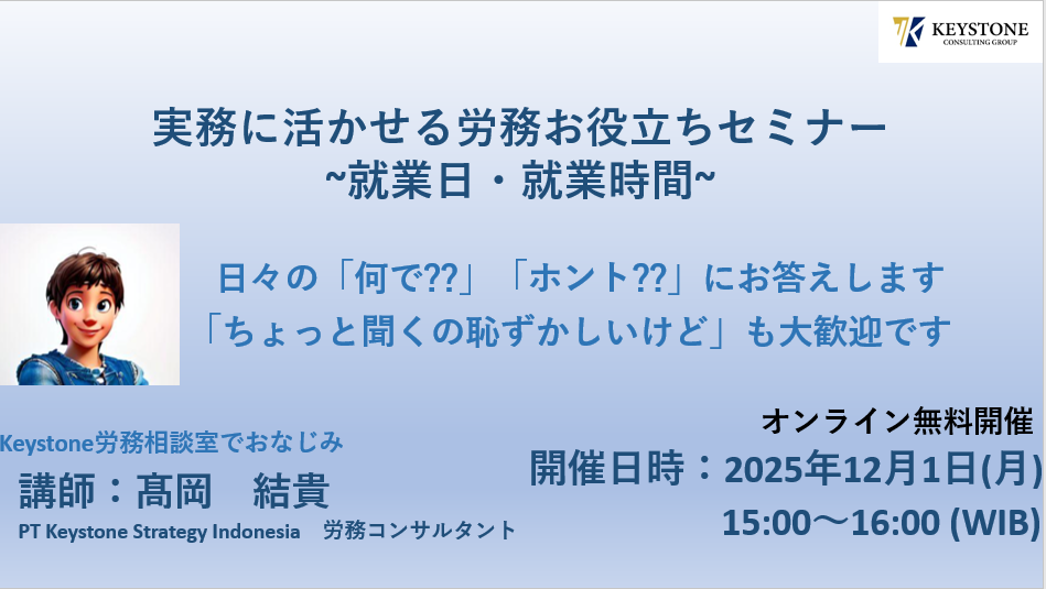 弊社では、「実務に活かせる労務お役立ちセミナー」と題し、インドネシアの労務に関する無料オンラインセミナーを毎月開催いたしております。