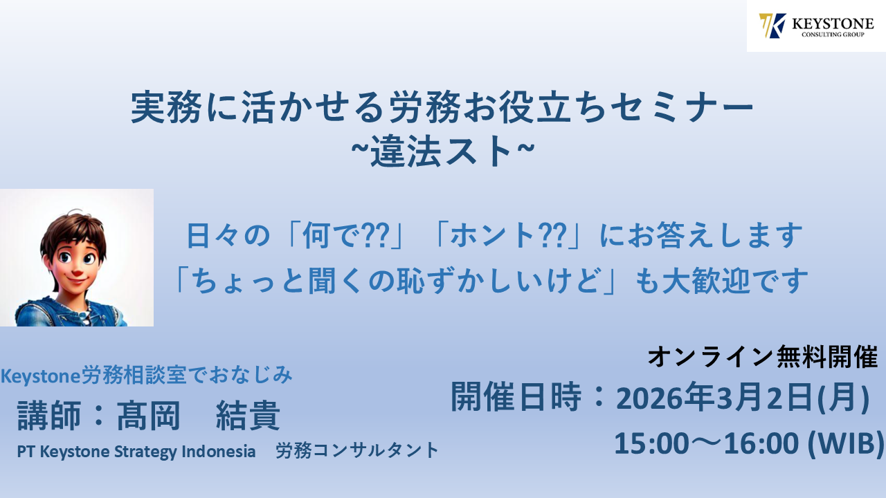弊社では、「実務に活かせる労務お役立ちセミナー」と題し、インドネシアの労務に関する無料オンラインセミナーを毎月開催いたしております。